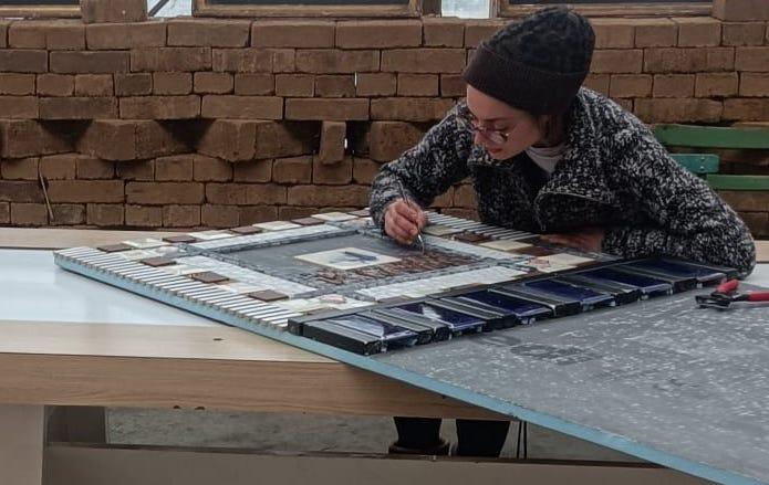 Installée aux Serres de Beaudreville, je développe un travail de mosaïque contemporaine centré sur la matière et la composition.